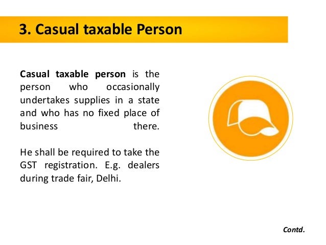 - 10. 3. Casual taxable Person Casual taxable person is the person who occasionally undertakes supplies in a state and who has no fixed place of business there. He shall be required to take the GST registration. E.g. dealers during trade fair, Delhi. Contd.