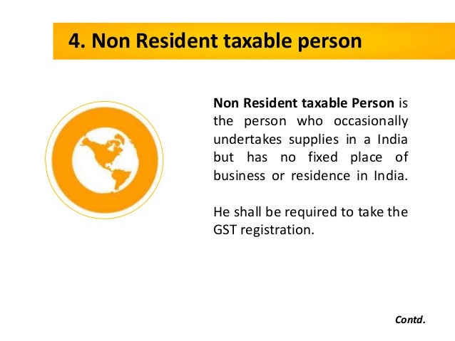 - 11. 4. Non Resident taxable person Contd. Non Resident taxable Person is the person who occasionally undertakes supplies in a India but has no fixed place of business or residence in India. He shall be required to take the GST registration.