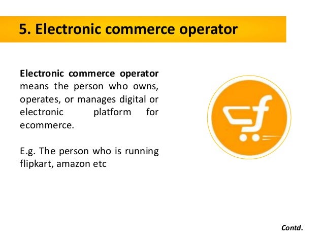 - 12. 5. Electronic commerce operator Electronic commerce operator means the person who owns, operates, or manages digital or electronic platform for ecommerce. E.g. The person who is running flipkart, amazon etc Contd.