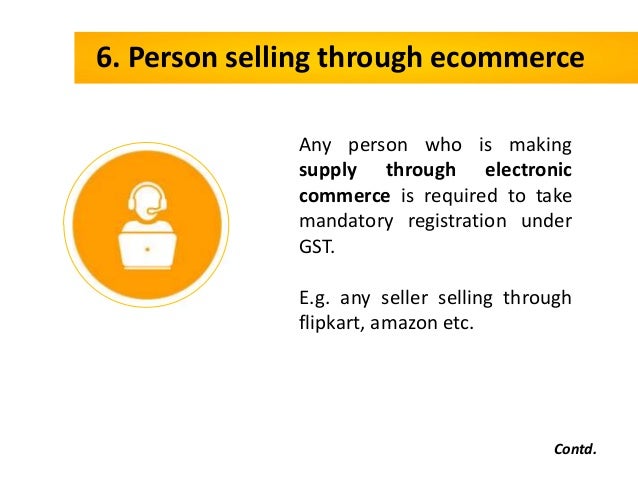 - 13. 6. Person selling through ecommerce Contd. Any person who is making supply through electronic commerce is required to take mandatory registration under GST. E.g. any seller selling through flipkart, amazon etc.