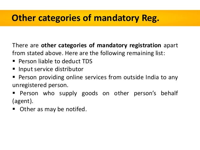 - 14. Other categories of mandatory Reg. There are other categories of mandatory registration apart from stated above. Here are the following remaining list: Person liable to deduct TDS Input service distributor Person providing online services from outside India to any unregistered person. Person who supply goods on other person’s behalf (agent). Other as may be notifed.