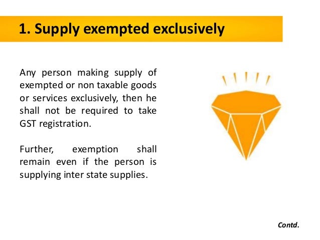 - 17. 1. Supply exempted exclusively Any person making supply of exempted or non taxable goods or services exclusively, then he shall not be required to take GST registration. Further, exemption shall remain even if the person is supplying inter state supplies. Contd.