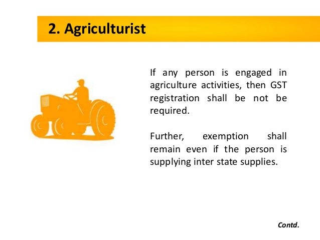 - 18. 2. Agriculturist Contd. If any person is engaged in agriculture activities, then GST registration shall be not be required. Further, exemption shall remain even if the person is supplying inter state supplies.