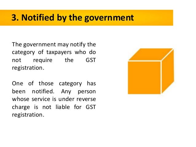 - 19. 3. Notified by the government The government may notify the category of taxpayers who do not require the GST registration. One of those category has been notified. Any person whose service is under reverse charge is not liable for GST registration.