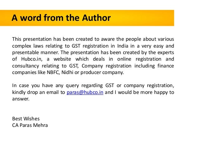 - 2. A word from the Author This presentation has been created to aware the people about various complex laws relating to GST registration in India in a very easy and presentable manner. The presentation has been created by the experts of Hubco.in, a website which deals in online registration and consultancy relating to GST, Company registration including finance companies like NBFC, Nidhi or producer company. In case you have any query regarding GST or company registration, kindly drop an email to paras@hubco.in and I would be more happy to answer. Best Wishes CA Paras Mehra