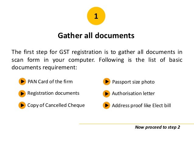- 21. 1 Gather all documents The first step for GST registration is to gather all documents in scan form in your computer. Following is the list of basic documents requirement: PAN Card of the firm Registration documents Copy of Cancelled Cheque Passport size photo Authorisation letter Address proof like Elect bill Now proceed to step 2