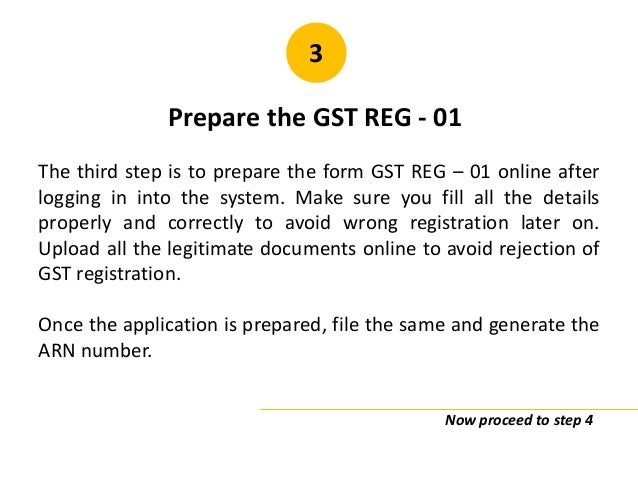 - 23. 3 Prepare the GST REG - 01 The third step is to prepare the form GST REG – 01 online after logging in into the system. Make sure you fill all the details properly and correctly to avoid wrong registration later on. Upload all the legitimate documents online to avoid rejection of GST registration. Once the application is prepared, file the same and generate the ARN number. Now proceed to step 4