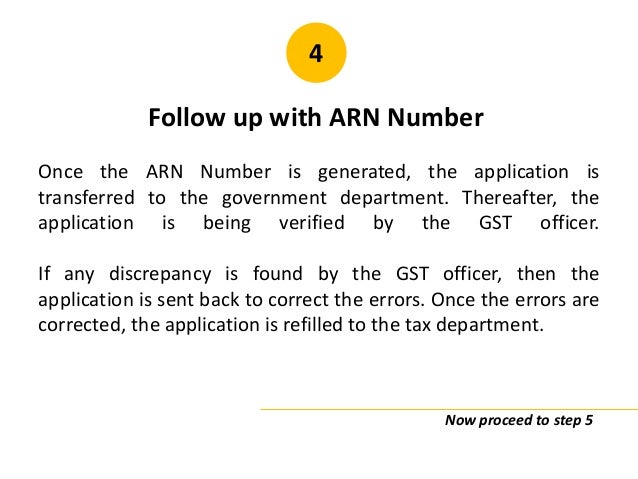- 24. 4 Follow up with ARN Number Once the ARN Number is generated, the application is transferred to the government department. Thereafter, the application is being verified by the GST officer. If any discrepancy is found by the GST officer, then the application is sent back to correct the errors. Once the errors are corrected, the application is refilled to the tax department. Now proceed to step 5