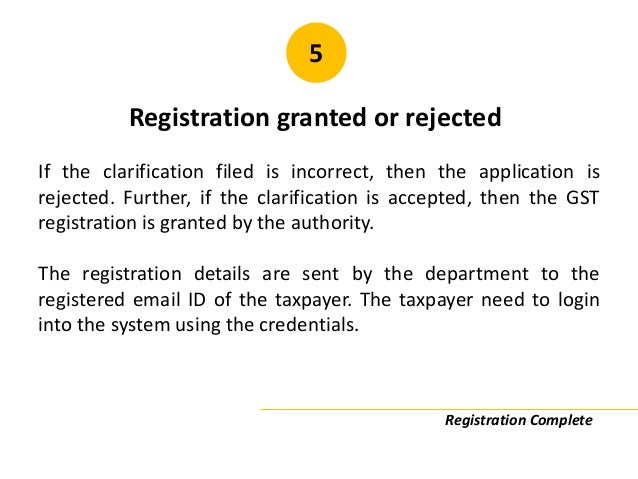 - 25. 5 Registration granted or rejected If the clarification filed is incorrect, then the application is rejected. Further, if the clarification is accepted, then the GST registration is granted by the authority. The registration details are sent by the department to the registered email ID of the taxpayer. The taxpayer need to login into the system using the credentials. Registration Complete