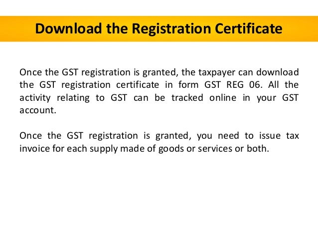 - 26. Download the Registration Certificate Once the GST registration is granted, the taxpayer can download the GST registration certificate in form GST REG 06. All the activity relating to GST can be tracked online in your GST account. Once the GST registration is granted, you need to issue tax invoice for each supply made of goods or services or both.