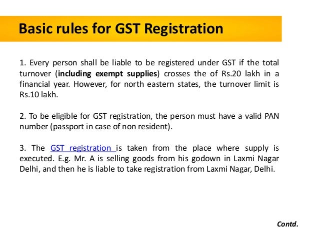 - 4. Basic rules for GST Registration 1. Every person shall be liable to be registered under GST if the total turnover (including exempt supplies) crosses the of Rs.20 lakh in a financial year. However, for north eastern states, the turnover limit is Rs.10 lakh. 2. To be eligible for GST registration, the person must have a valid PAN number (passport in case of non resident). 3. The GST registration is taken from the place where supply is executed. E.g. Mr. A is selling goods from his godown in Laxmi Nagar Delhi, and then he is liable to take registration from Laxmi Nagar, Delhi. Contd.