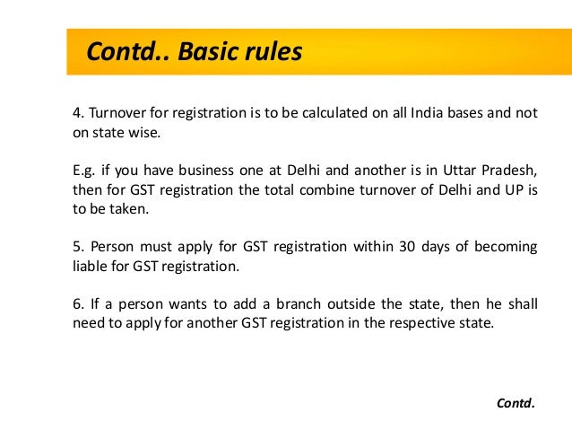 - 5. Contd.. Basic rules 4. Turnover for registration is to be calculated on all India bases and not on state wise. E.g. if you have business one at Delhi and another is in Uttar Pradesh, then for GST registration the total combine turnover of Delhi and UP is to be taken. 5. Person must apply for GST registration within 30 days of becoming liable for GST registration. 6. If a person wants to add a branch outside the state, then he shall need to apply for another GST registration in the respective state. Contd.