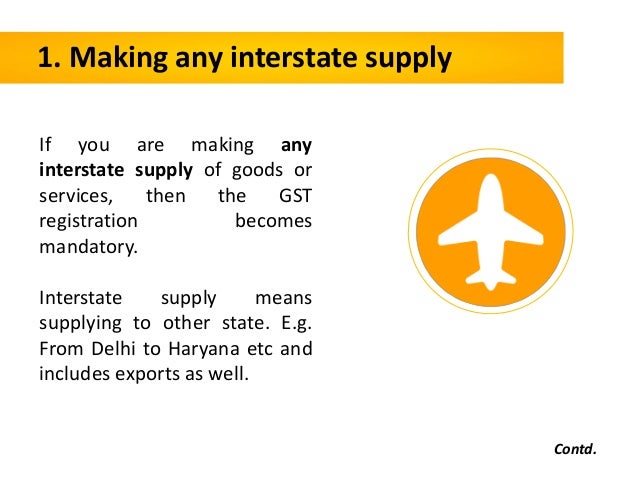 - 8. 1. Making any interstate supply If you are making any interstate supply of goods or services, then the GST registration becomes mandatory. Interstate supply means supplying to other state. E.g. From Delhi to Haryana etc and includes exports as well. Contd.