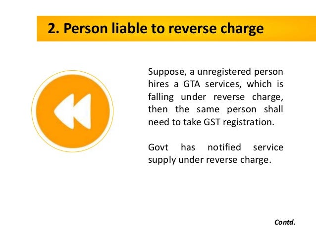 - 9. 2. Person liable to reverse charge Contd. Suppose, a unregistered person hires a GTA services, which is falling under reverse charge, then the same person shall need to take GST registration. Govt has notified service supply under reverse charge.